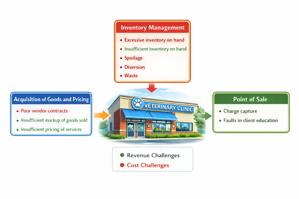 Similarly, goods move through a veterinary clinic through various channels, and many “pathologies” can be applied to each of those processes, but a bird’s eye view of the journey of those products from ordering through to point of sale allows us to create three larger buckets: